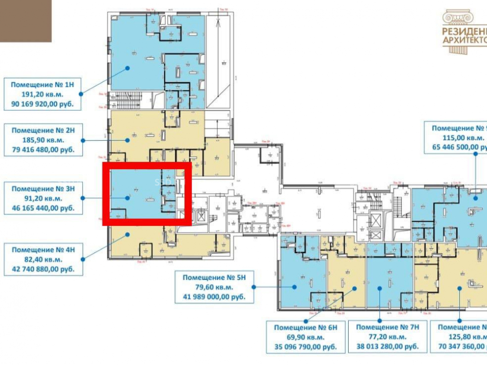 Помещение № 3Н общей площадью – 91,2 кв. м., 1 этаж. Отдельный вход. Витринные окна. Открытая планировка. Высокие потолки – 4 м. Электрическая мощность – 18,2 кВт. Центральные коммуникации. Наземный и подземный паркинг.