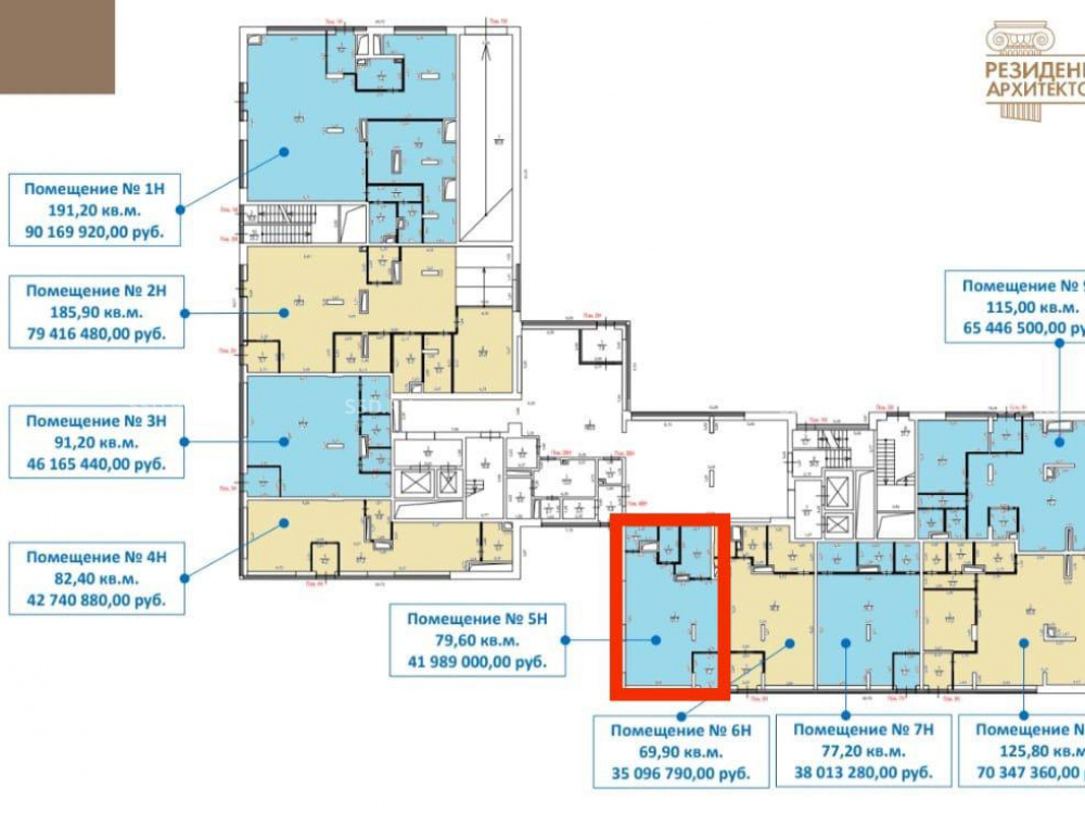 Помещение № 5Н общей площадью – 79,6 кв. м., 1 этаж. Отдельный вход. Витринные окна. Открытая планировка. Высокие потолки. Электрическая мощность – 15,9 кВт. Центральные коммуникации. Отапливаемая подземная парковка, собственный пешеходный бульвар.