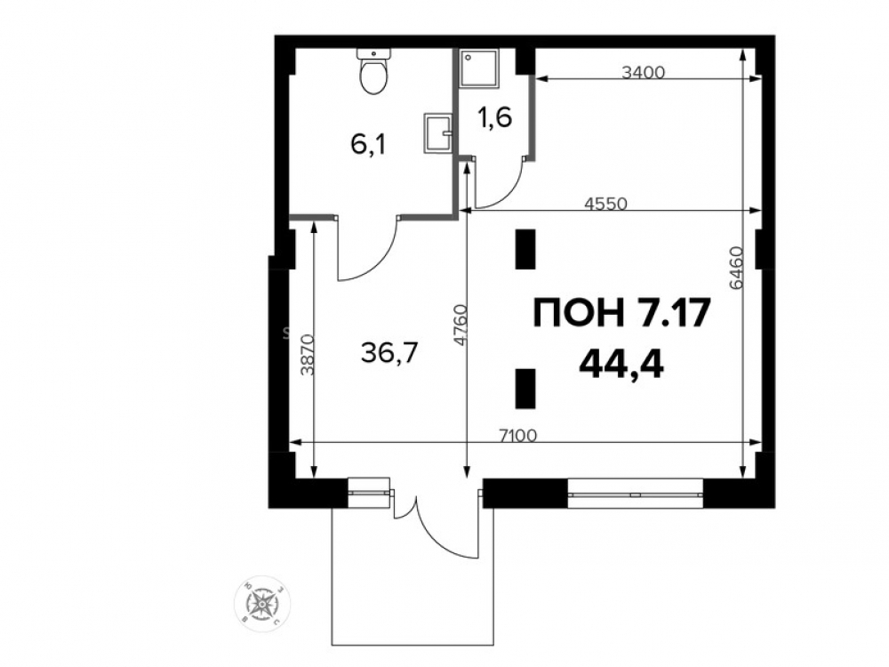 Общая площадь: 44.4 м2