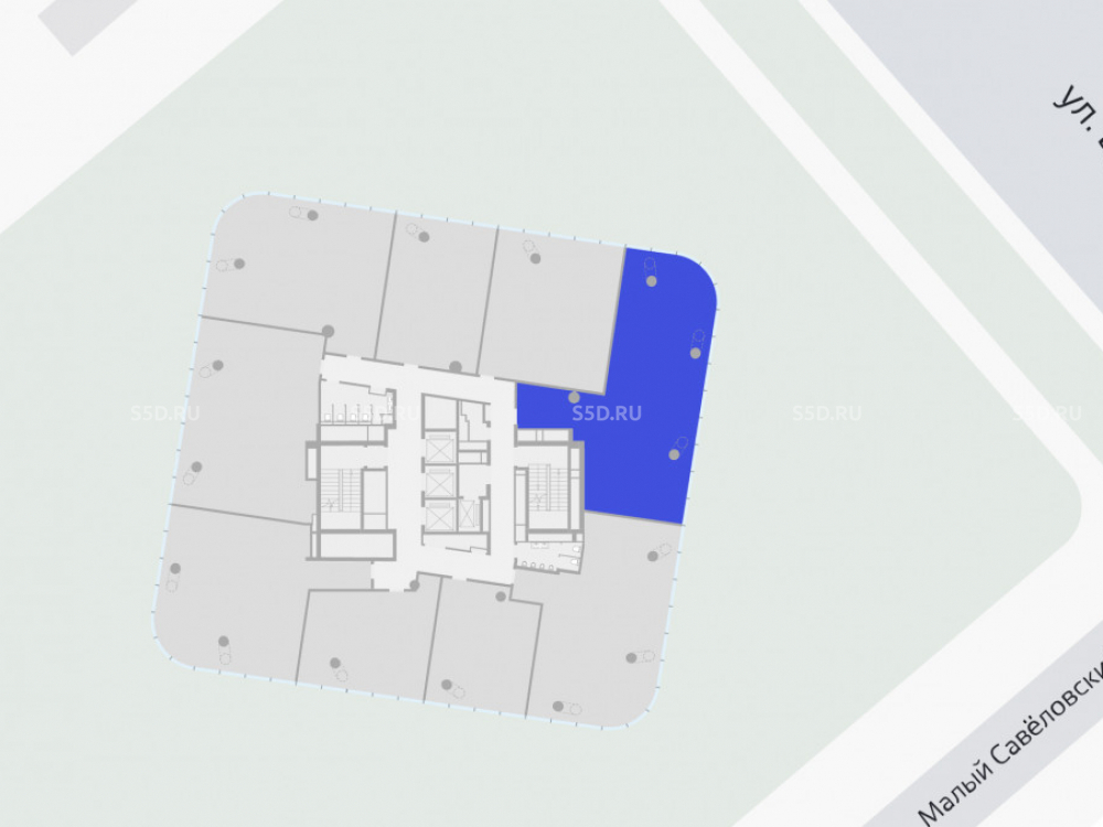 В здании всего девять этажей, семь из которых занимают 56 офисов площадью от 49 м2, часть из них — с террасами.