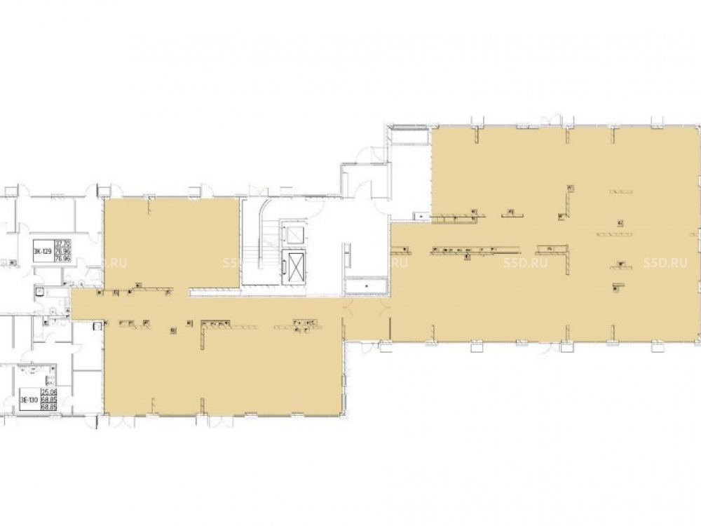 Общая площадь помещения - 569 м2. 1 й этаж. 1 вход с улицы. 1 мокрая точка. Отделка shell&core. Высота потолков 5,7 метров. Эл.мощность - 75 кВт. Витринное остекление. Место под фасадную вывеску. Количество квартир в ЖК, 238.