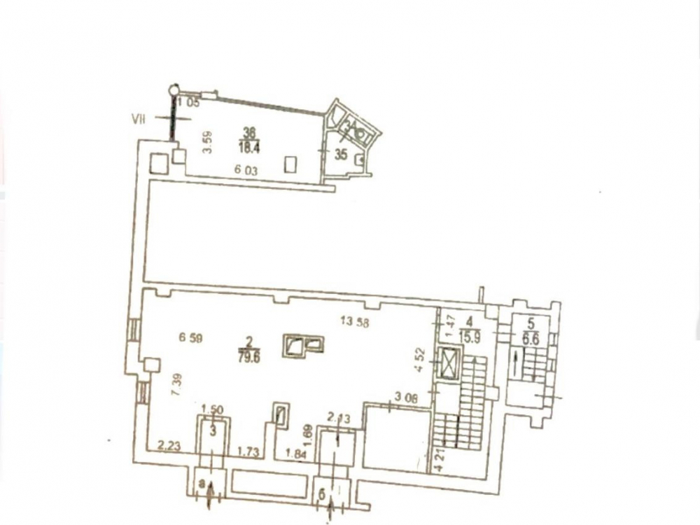 Помещение имеет три уровня, общая площадь - 433 кв.м. (1 этаж - 262,8 кв.м., цоколь с окнами - 129,4 кв.м., подвал - 40.8 кв.м.)