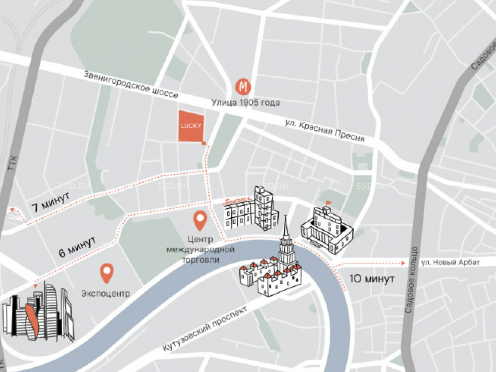 Транспортная доступность: БЦ Lucky расположен между улицами 2-й Звенигородская и Костикова, в 200 метрах от станции метро «Улица 1905 года». До центра деловой жизни -