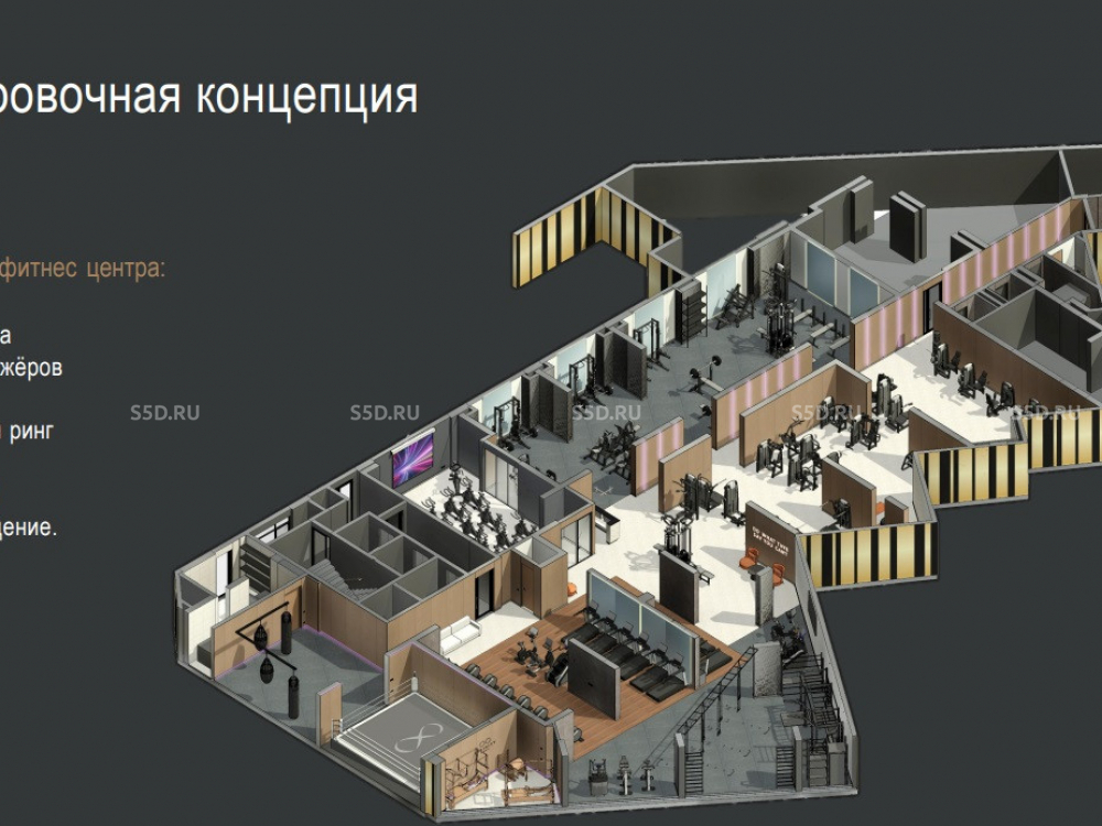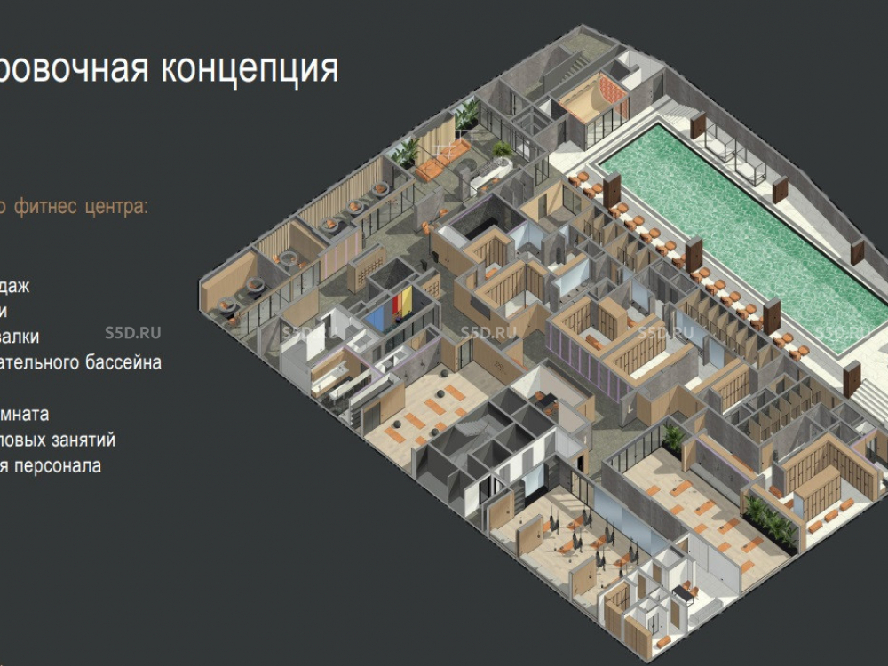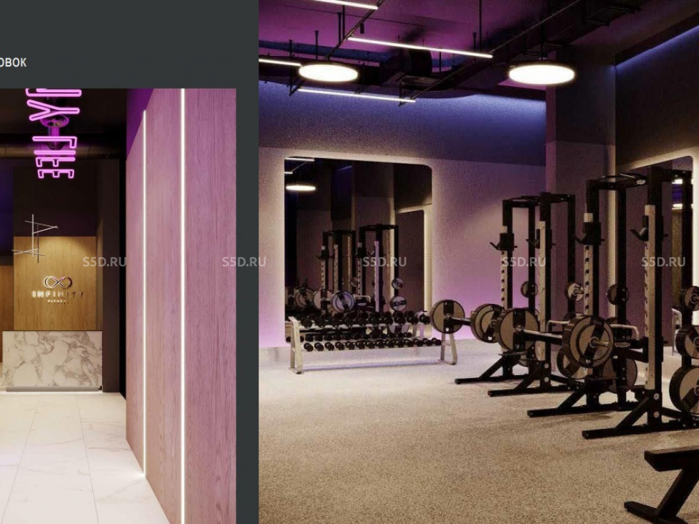 Помещение спроектировано с возможностью создания полноценной «мокрой зоны» (бассейн 25 метров c 3-мя дорожками), спа зоной, техническими помещениями включая помещения водоочистки и водоподготовки, оснащено передовой системой вентиляции и отвечает всем современным требованиям к помещениям фитнес-индустрии. Тренажерный зал, боксерский ринг, залы групповых программ, детский фитнес, зона Workout и площадки для групповых занятий на открытом воздухе. Планировка предусматривает зону для кафе или бара.