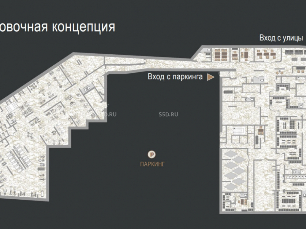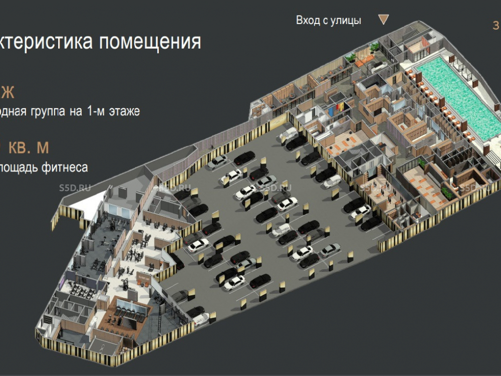 Прямой вход с улицы и паркинга. Удобный паркинг для клиентов и гостей клуба. Место под вывеску на фасаде и стеллах. Полностью готовый дизайн проект, комплект рабочей документации и бизнес модель.