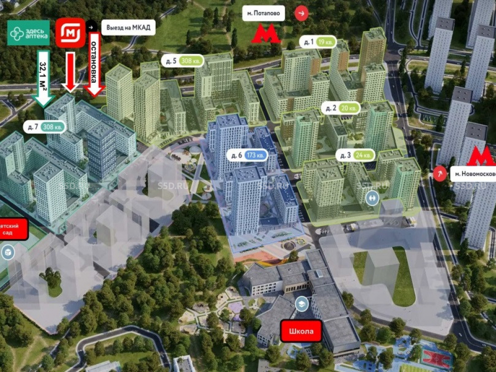 ЖК расположен в юго-западной части Москвы – 9 км от МКАД и 1,7 км от ст. метро «Потапово».