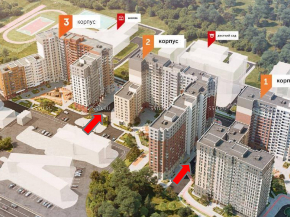 На территории 12,5 Га расположены 4 многосекционных корпуса переменной этажности.