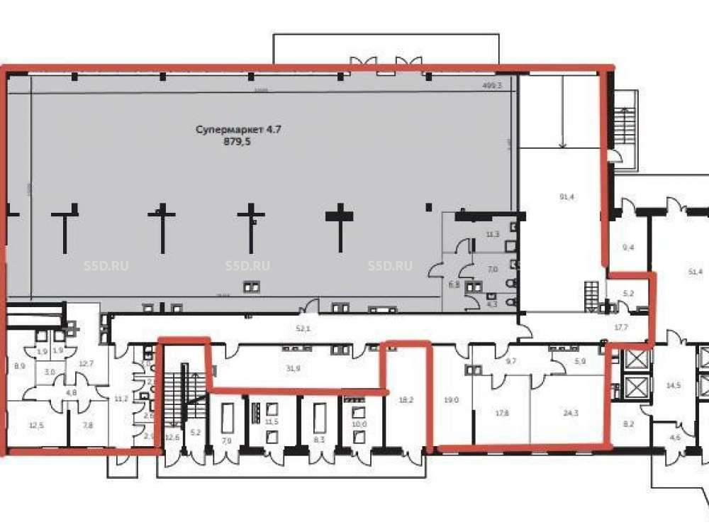 Технические характеристики: Площадь помещения 873,6 кв.м (из них арендуемая супермаркетом площадь 576 кв.м.).