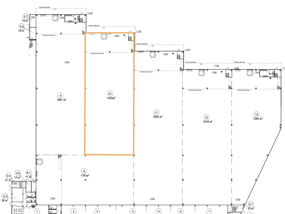 • Шаг колонн 18х24 только по границе помещения