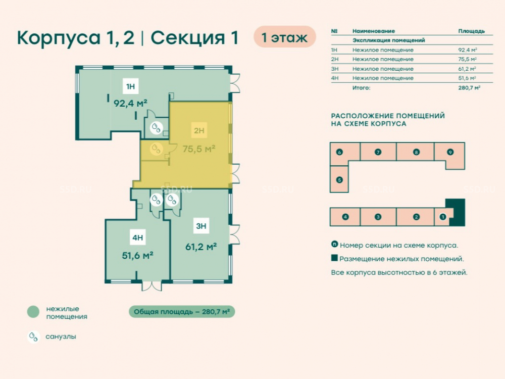 1-й этаж жилого дома. Общая площадь 75.5 м2. Отдельный вход с улицы. Мокрая точка. Высота потолков 3.9 м. Витринное остекление. Все центральные коммуникации. Эл. мощность 15.1 кВт. Помещение в бетоне. Отличные рекламные возможности.