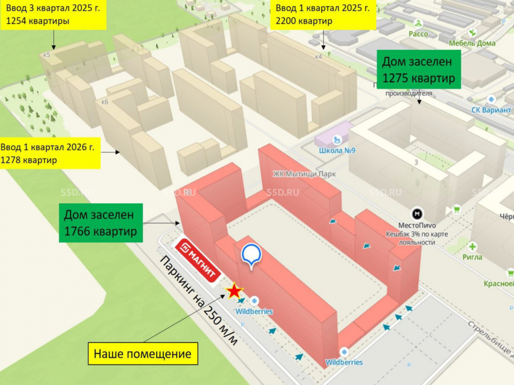 В продажу предлагается торговое помещение в ЖК комфорт – класса «Мытищи – Парк» по адресу: Московская область, г. Мытищи, 1-й Стрелковый переулок, корп. 3. Ближайшие станции метро: Медведково – 20 мин. на транспорте, до станции ж/д «Строитель» - 5 мин. на автомобиле / 25 мин. пешком. Новый крупный ЖК с отличным рекламным потенциалом. Вокруг крупный жилой массив. Возле помещения единственная арка. Рядом с помещением открываются Магнит и Пятёрочка. «Мытищи Парк» - проект одного из ведущих российских застройщиков, компании «Самолет». ЖК расположен в подмосковных Мытищах рядом с Пироговским лесопарком. До национального парка «Лосиный остров» и «Пироговского водохранилища» - 15 мин. на автомобиле. По проекту в комплексе запланировано 6 корпусов. Первые 3 корпуса будут сданы в 2023 – 2024 годах, 2026 год – срок полной реализации. Хороший пешеходный и автомобильный трафик.