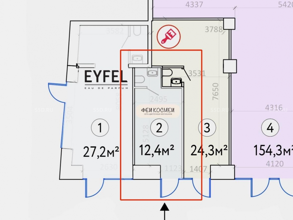 Общая площадь помещения 12,4 кв.м. Высота потолков - 3,5 метра. Электрическая мощность предоставляется в необходимом объеме. Первая линия, отдельный вход, витринные окна. Высокий рекламный потенциал. Центральные коммуникации.