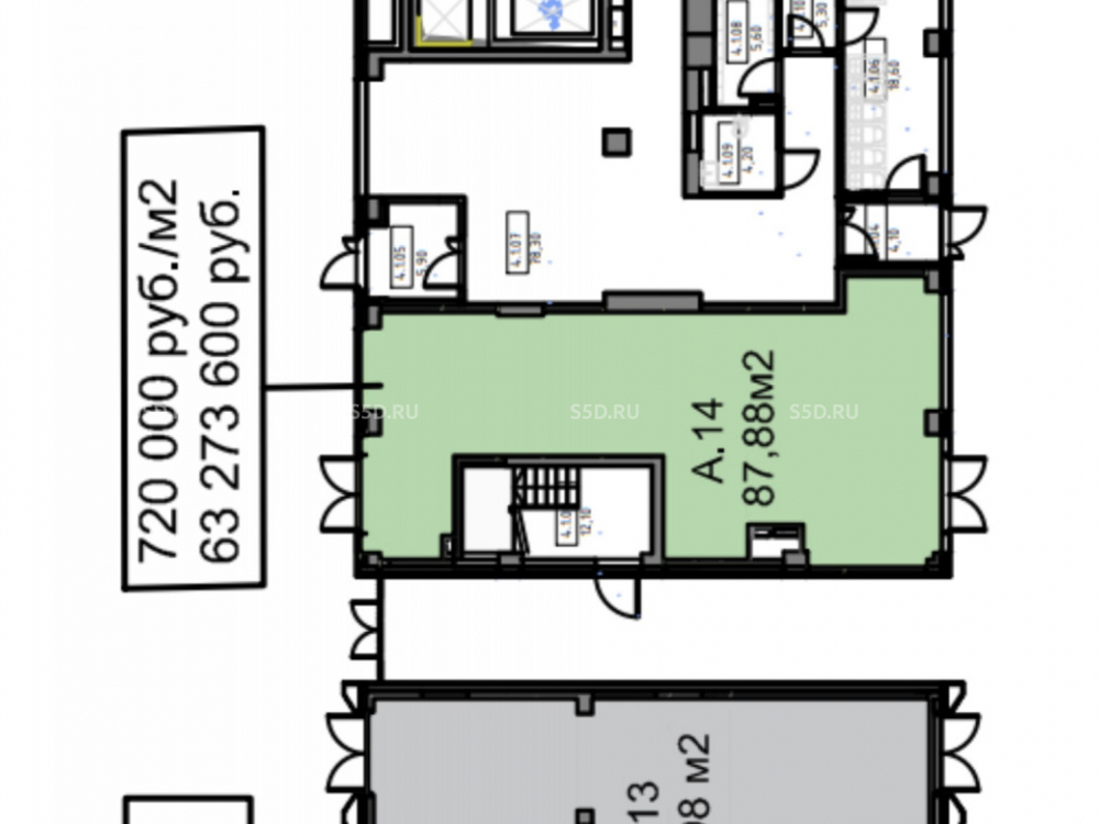 1-й этаж жилого дома. Общая площадь 87,88 м². 2 отдельных входа. Высота потолков 4.8 м. Витринное остекление. Свободная планировка. Все центральные коммуникации. Технологической вытяжки нет.