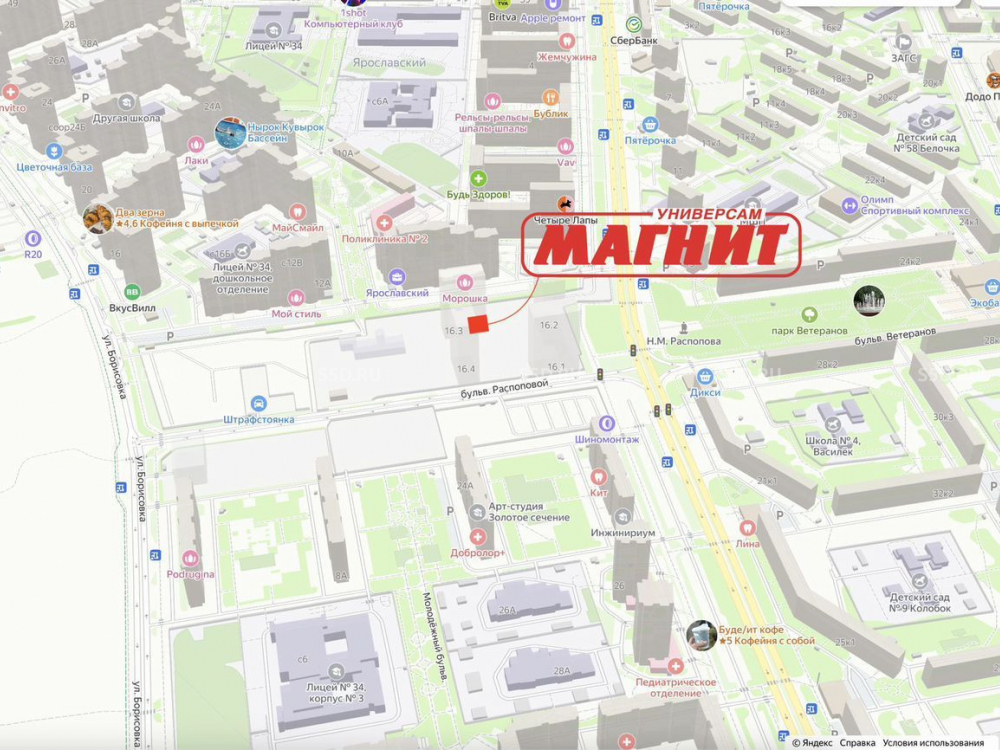 Торговое окружение: Пятерочка, Продукты, Буханка, кафе и рестораны.