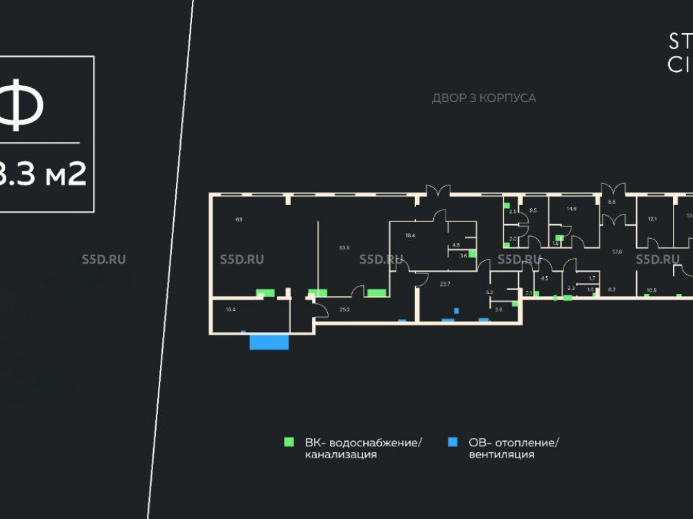 Получение ключей в 4 квартале 2026 г. Помещение общей площадью: 393,3 кв. м., (Ф). Расположение: 1 этаж, двор 3 корпуса. Отдельный вход. Витринное остекление. Высота потолков: 3 м. Электрическая мощность: по запросу. Безопасность: круглосуточная охрана, система контроля доступа и видеонаблюдения. Паркинг: подземный (2 уровня, 538 машиномест).