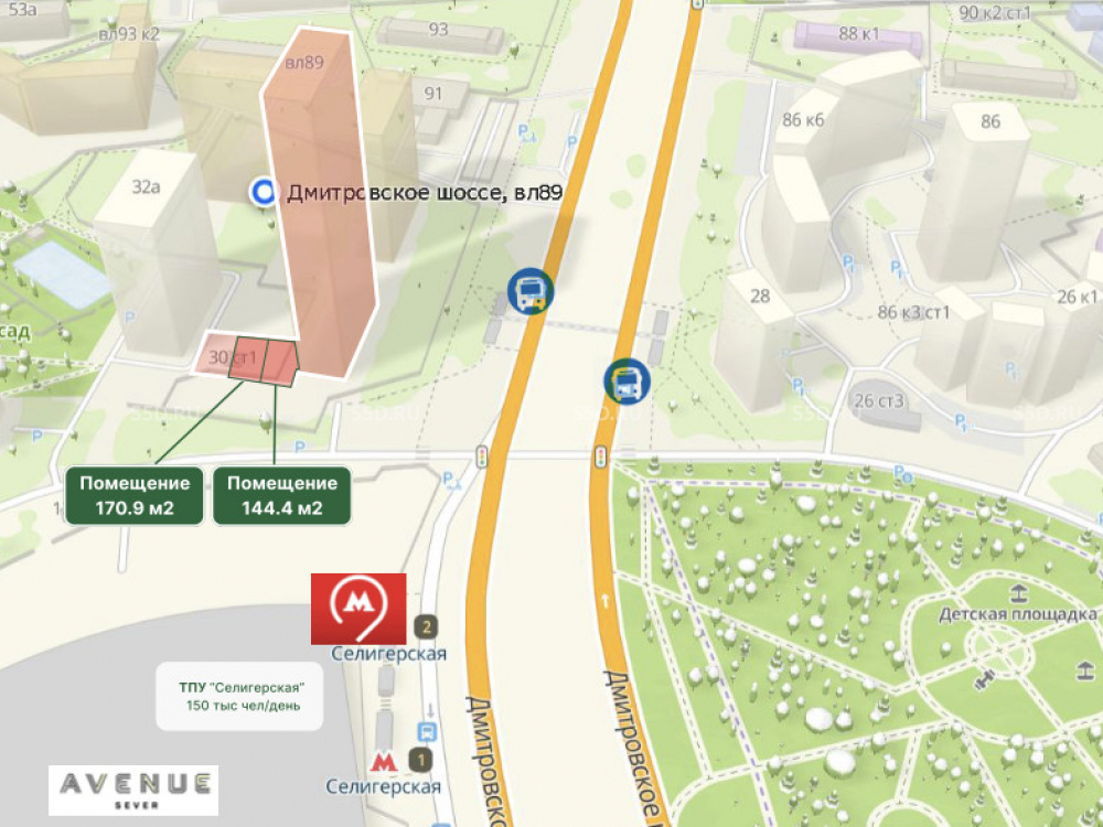 Ближайшая станция метро - м. Селигерская, 1 минута пешком. Встроенно-пристроенное торговое помещение с 2-мя отдельными входами на первом этаже 46-ти этажного жилого дома. Помещение удачно расположено на пешеходном и автомобильном трафике. Напротив помещения открывается один из крупнейших ТЦ Москвы “AVENUE SEVER” с ожидаемым трафиком 45 000 чел/день. Ввод в эксплуатацию жилого дома- 2 кв. 2027 года.
