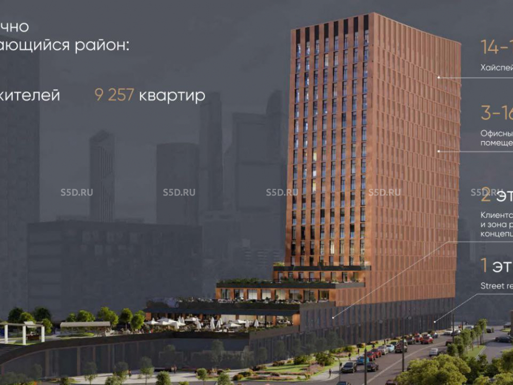 Общая площадь: 309.53 кв. м., 1 этаж. Панорамное остекление. Высокие потолки. Электрическая мощность – по запросу. Приточная вентиляция. Центральное кондиционирование. Пожарная сигнализация. Каскад общественных террас. Охраняемый подземный паркинг на 108 машиномест. Круглосуточная охрана и пропускная система.