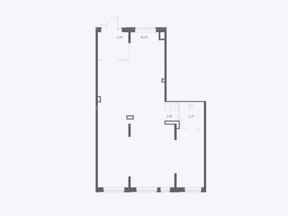 Вентиляция, витринное остекление, высокие потолки. Эл. мощность 200 Вт/м². Отделка shell&core.