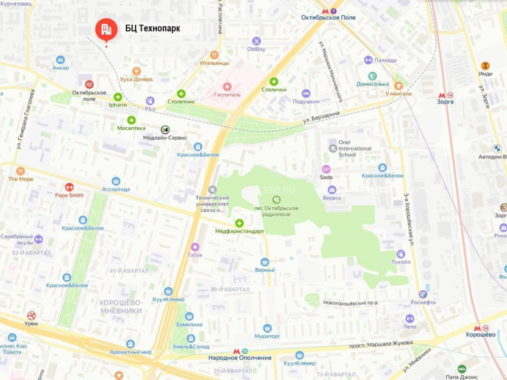 Ближайшая станция метро - м. Октябрьское поле, 23 минуты пешком. Помещение расположено на 1 этаже БЦ "Октябрьское поле". В шаговой доступности Вкусвилл, Пятерочка, кофейни, аптеки. Бизнес-центр имеет 8 этажей, расчетное количество персонала 800 человек. Новое здание. Окружение: в 10 минутах пешком ресторанов нет, вокруг здания БЦ в шаговой доступности (1-5 минут) ЖК Квартал, ЖК Октябрьское поле. Около 12000 жителей. Обеспеченный средний класс, молодые, активные потребители.