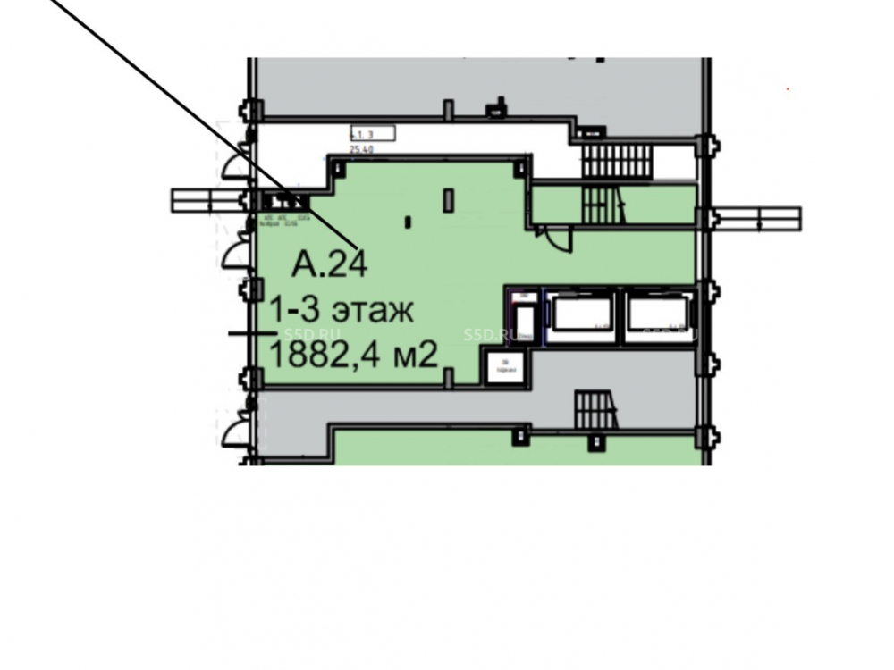 1й - 3й этажи жилого дома. Общая площадь 1 882.4 м². Отдельный вход. Высота потолков 4.8 м. Витринное остекление. Свободная планировка. Все центральные коммуникации. Технологической вытяжки нет.