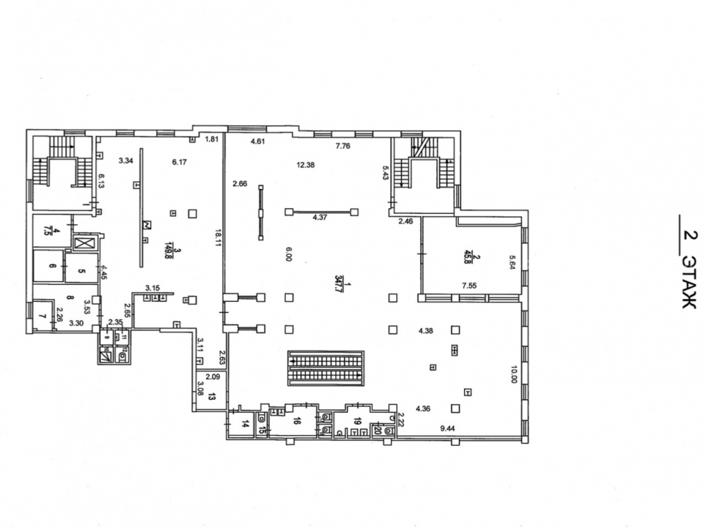 Общая площадь: 2 716.5 м2, из них подвал - 1346.5 м2, h-3.5 метра, 1 этаж - 756 м2, h-3.8 метра, 2 этаж - 614 м2, h-3 метра.
