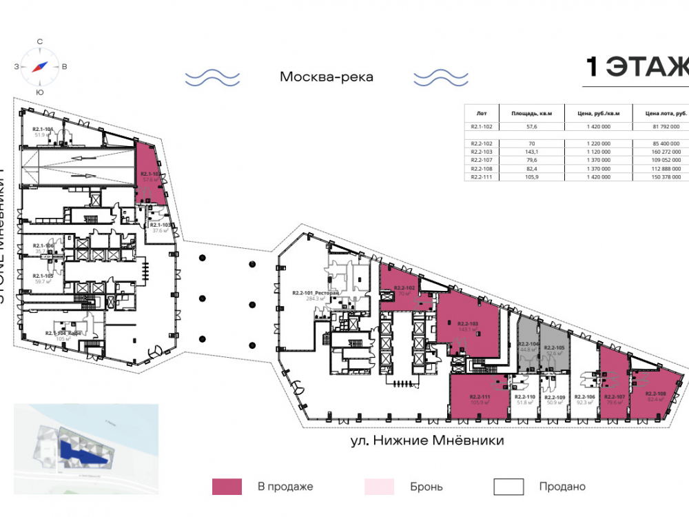Общая плoщaдь: 105,3 кв.м. на первом этаже 12 ти этажного здания (башня M2.2). Прямой выход к набережной. Количество входов: 2 (с улицы).