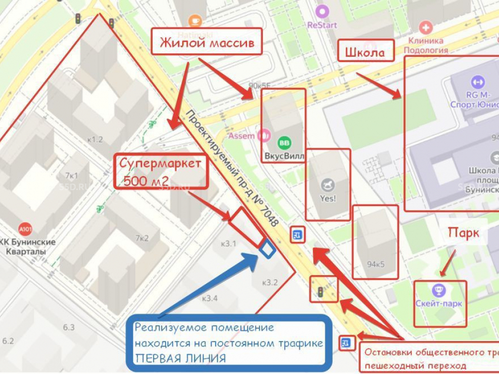 Ближайшая станция метро - м. Потапово, 25 минут пешком. Помещение расположено на 1 этаже дома с коммерческими помещениями. Первая линия pядoм c Cупepмаркетoм. Рядoм остановки oбщеcтвeннoго трaнспopта и дeйствующий пeшexoдный пepеход co сторoны ЖK Бунинские лугa. Крупный жилой массив, большой пешеходный и автомобильный трафик. Ввод в эксплуатацию - 3 квартал 2025 года.
