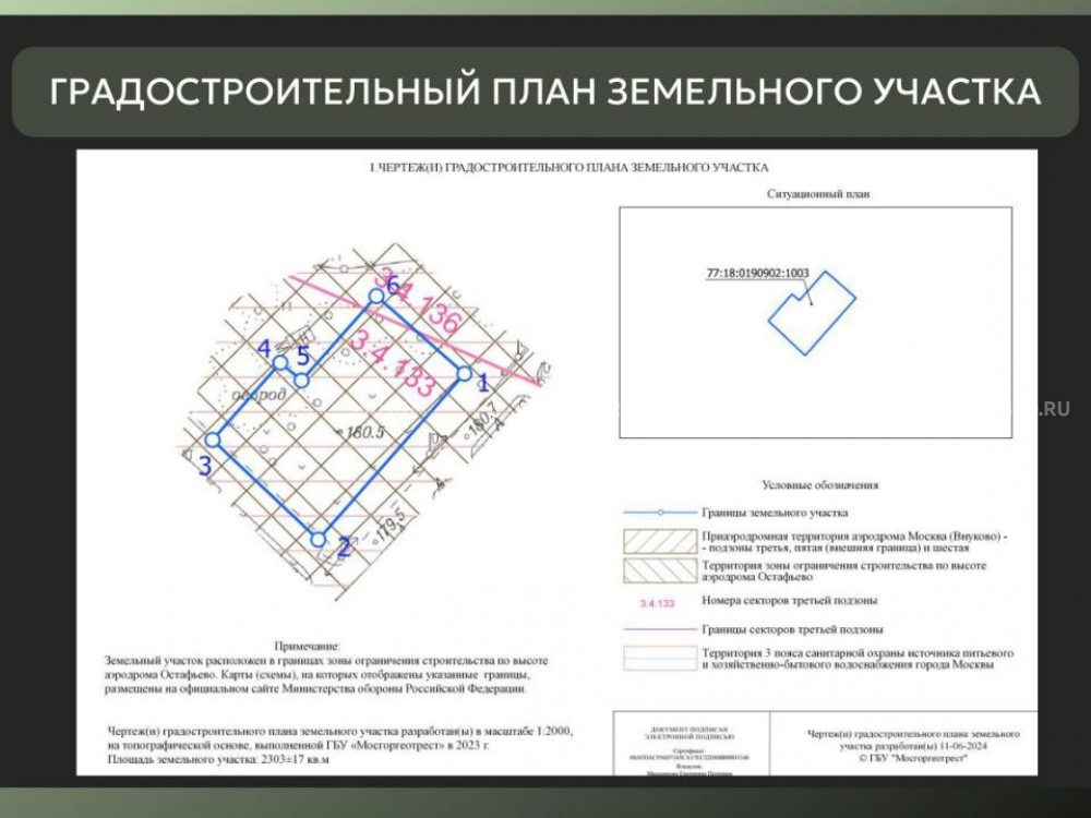 Площадь участка: 2303 кв. м. Разрешенная застройка: ~900 кв.м. Кадастровый номер: 77:18:0190902:1003. Кадастровый квартал: 77:18:0190902. Категория земель: Населенные пункты. ВРИ: 3.6.1 (культурно-досуговые объекты), 4.6 (общественное питание). Коммуникации: Электричество, водопровод, газ по границе участка.
