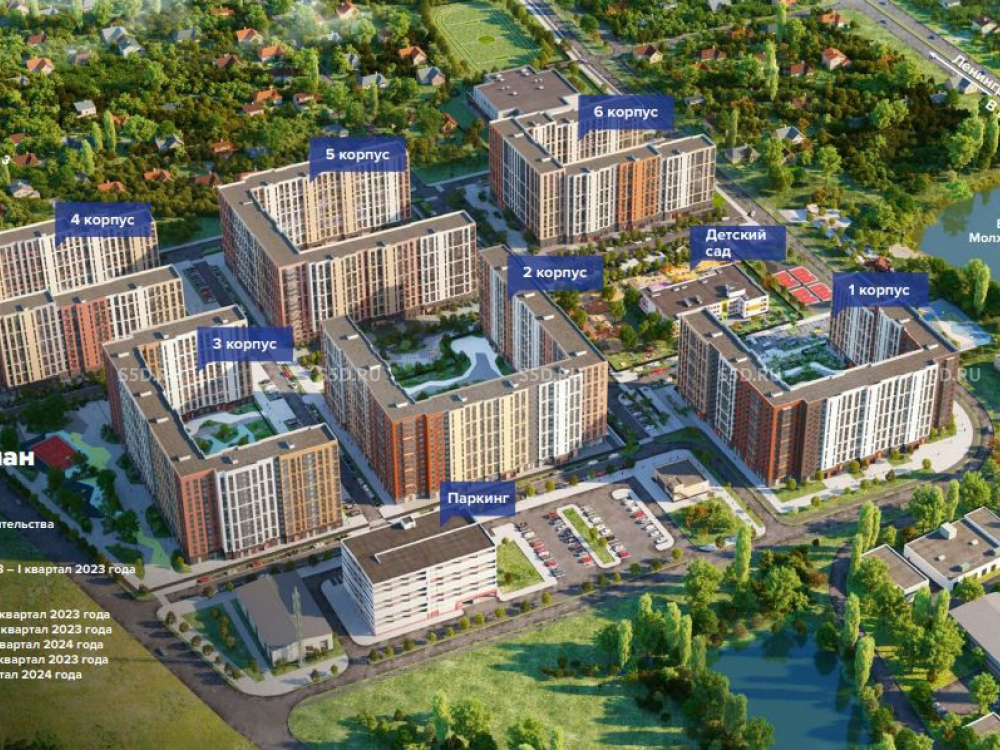Комплекс состоит из 6 домов переменной этажности (от 12 до 15 этажей), наземного паркинга, детского сада и школы.