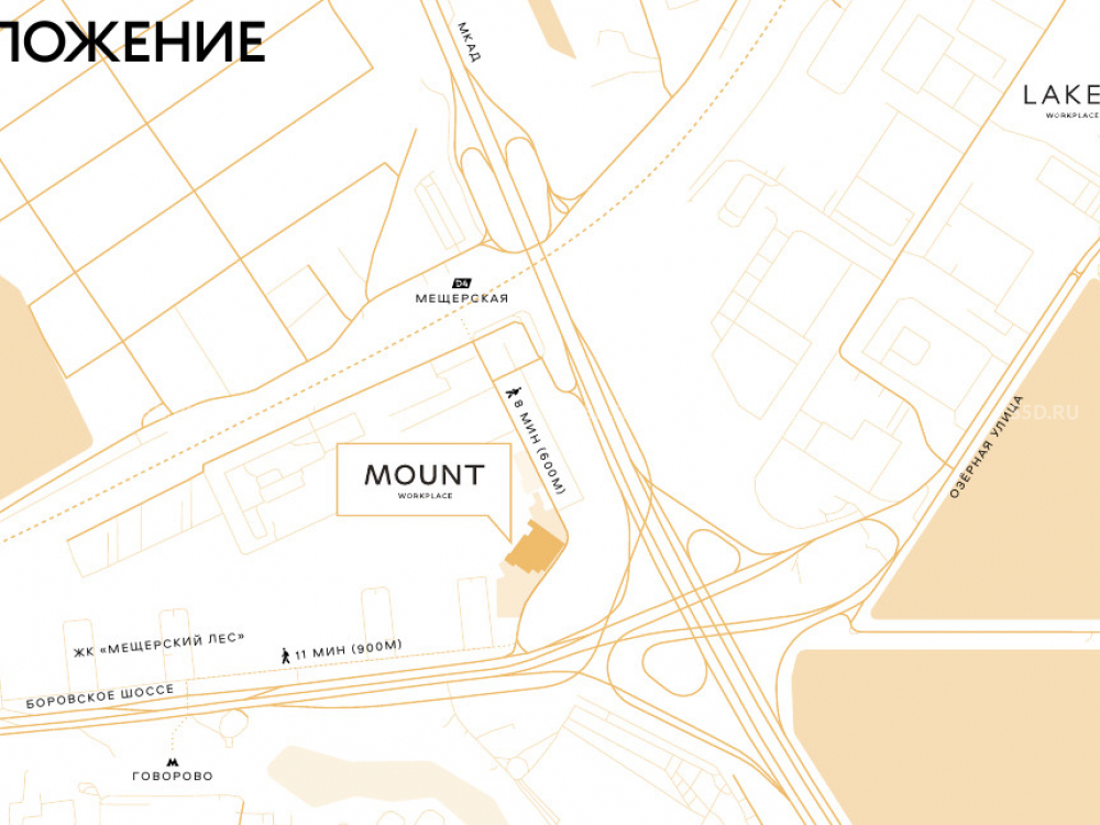 сочетающийся с природой. Архитектурную концепцию MOUNT разработало бюро BLANK. В основе — образ утеса как символа устойчивости и силы. Силуэт здания расширяется книзу за счет разновеликих этажей, формируя визуально динамичную и монолитную композицию. Лаконичная башня — прекрасное место для ведения бизнеса благодаря выгодной транспортной доступности здания. В рамках развития территории запланировано благоустройство зеленого Парка холмов с прогулочными зонами. До станции метро «Говорово» 11 мин. пешком . До станции МЦ «Мещерская» 8 мин. пешком.