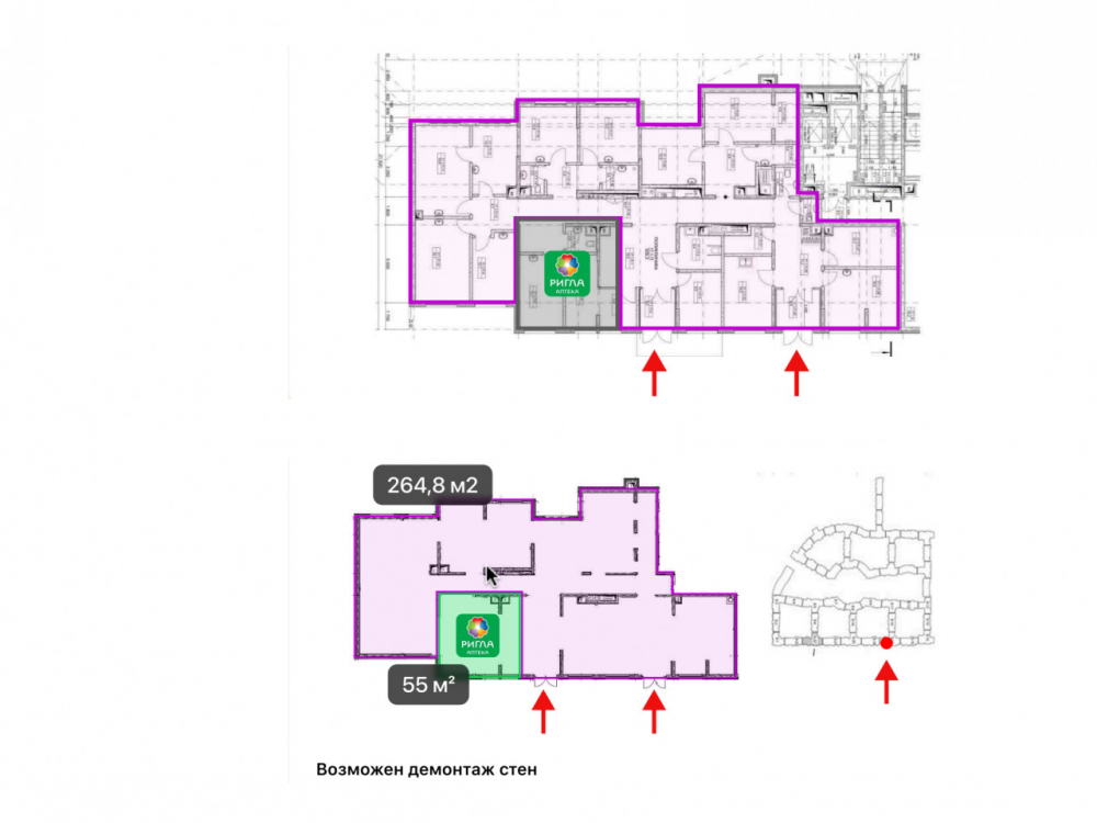 Арендованная: 55 кв.м. Аптека "Ригла", ДА на 7 лет с 2025 г, индексация 5%. МАП: 165 000 руб.