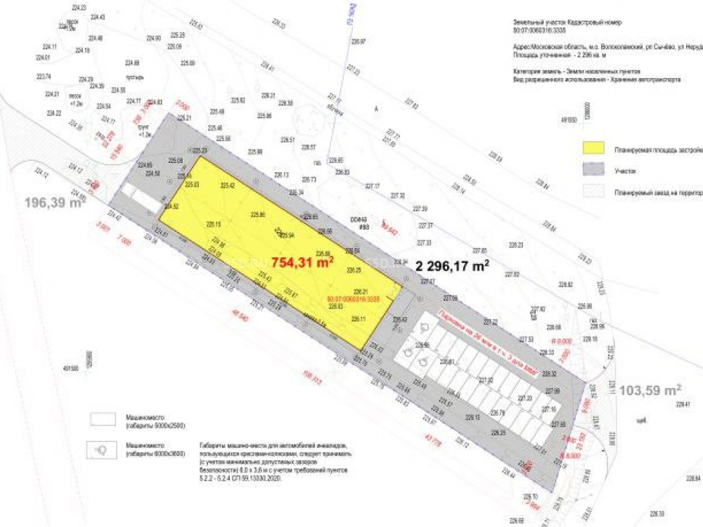 Площадь участка: 2 296 м². Площадь здания: 750 м². Кадастровый номер (ЗУ): 50:07:0060316:3335. Категория земель: Земли населенных пунктов. Вид разрешенного использования: Хранение автотранспорта. Коммуникации: Водоснабжение и канализация (возможно подключение). Электричество (мощность уточняется). Подъездные пути с асфальтовым покрытием.