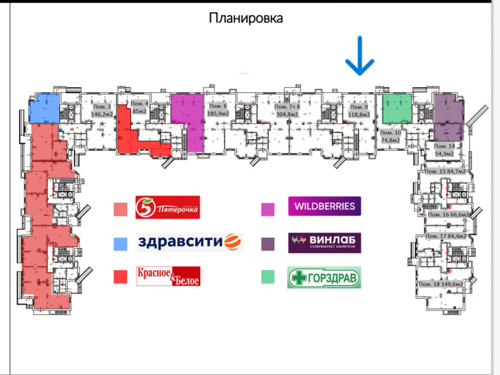 Технические характеристики: Общая площадь - 118,8 кв.м, 1-й этаж 17-ти этажного жилого дома.