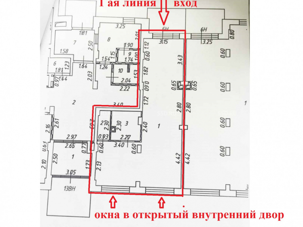 1 этаж 12-этажного жилого дома, площадь 53,3 м², открытая планировка, вход с 1 линии, витринные окна в открытый двор с другой стороны помещения, высота потолка 4.5м. Электрическая мощность 15 кВт с возможностью увеличения. Помещение в бетоне. Парковка перед фасадом. Место для размещения вывески. Корпус сдан в августе 2025, заселяется.
