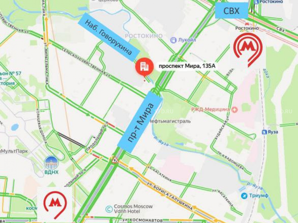Адрес: г. Москва, СВАО, район Ростокино, пр-кт Мира, 135А. Премиальное расположение на главной транспортной артерии города. Ближайшая станция метро: ВДНХ – 10 мин. транспортом. В шаговой доступности остановки общественного транспорта. Высокий пешеходный и автомобильный трафик - более 25 000 человек в день. Рядом знаковые объекты: ВДНХ, Останкинская телебашня, Ботанический сад. Развитая инфраструктура: банки, аптеки, рестораны, фитнес-центры в непосредственной близости.