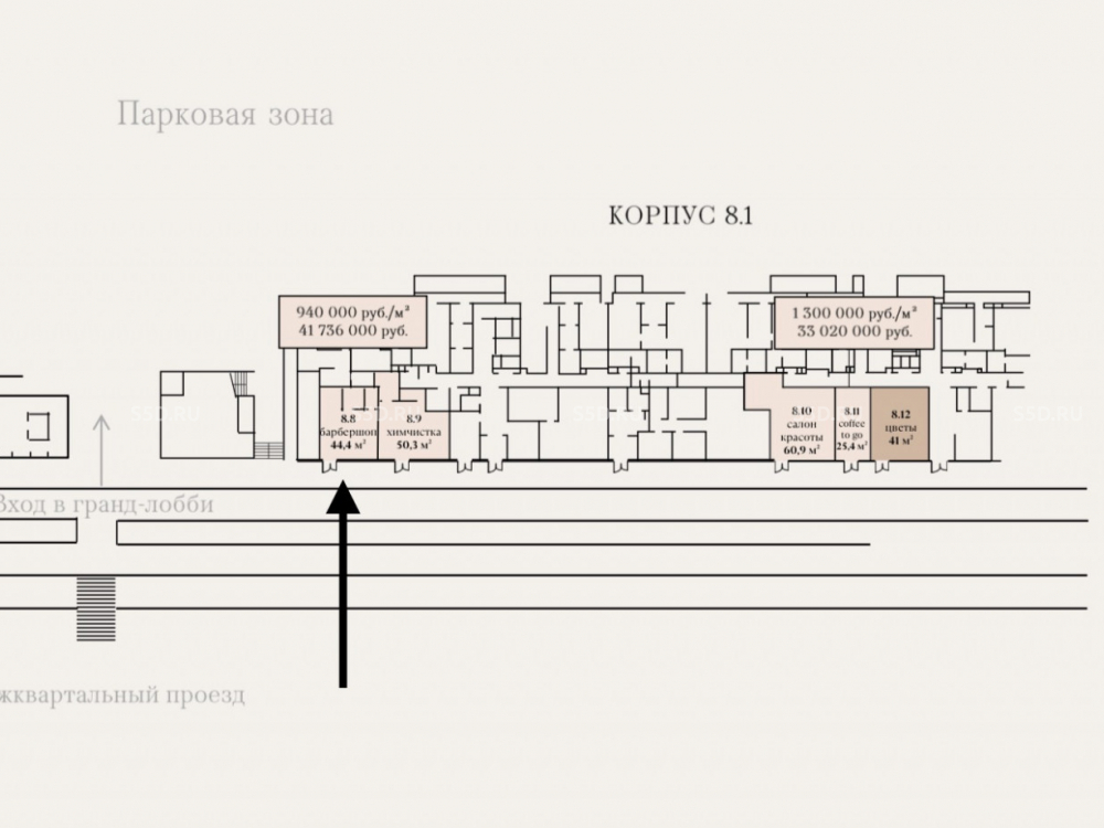 Общая площадь - 44.4 м2. Отдельный вход с улицы. Витринное остекление. Высота потолков - 5.2 м. Электрическая мощность - 18 кВт. Все центральные коммуникации. Состояние помещения - без отделки.