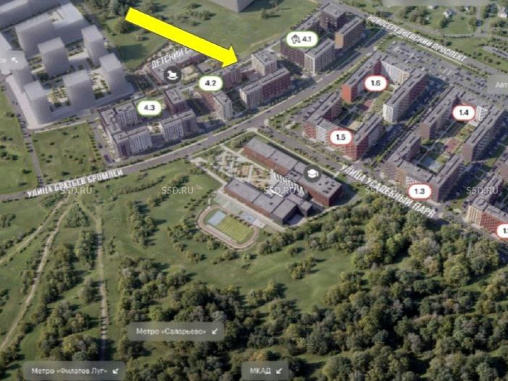 Адрес: г. Москва, НАО, мкр. Филимонковский, ул. Братьев Бромлей, 5к1. ЖК «Середневский лес» строится в Новой Москве, недалеко от Валуевского леса. В 15 минутах на автомобиле две станции метро «Филатов луг» и «Саларьево», от них до центра Москвы всего 35 минут. На рейсовом автобусе от жилого квартала до метро «Филатов луг» - 20 минут. Развитая инфраструктура: в шаговой доступности будут расположены школа, детский сад, игровые площадки и крупная детская зона PlayHub.