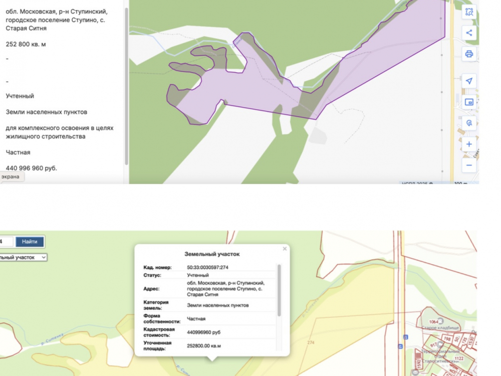 Земельный участок, 252800 м2 (кадастровый номер 50:33:0030597:274), наличие адреса: Московская обл, р-н Ступинский, городское поселение Ступино, с.Старая Ситня.
