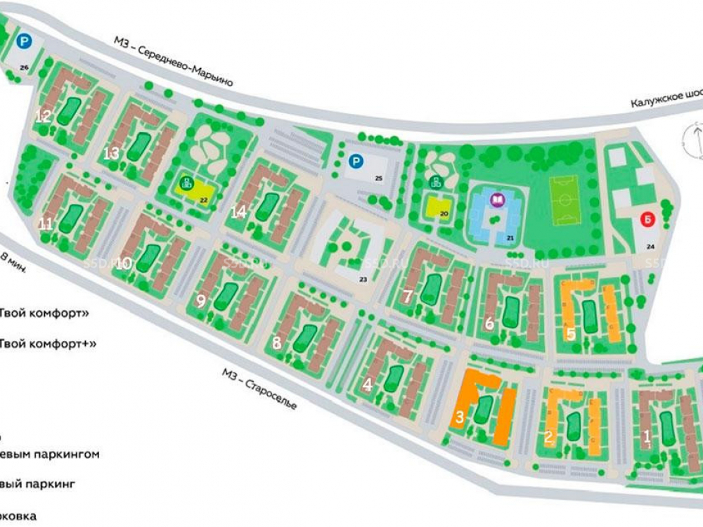 ЖК комфорт-класса "Цветочные Поляны экопарк" от ГК "Самолёт" - 8 разноуровневых корпусов от 6 до 16 этажей – 2600 квартир на 6000+ жителей. Все квартиры в ЖК сдаются покупателям с отделкой «под ключ». В 5-ти минутах пешком планируется строительство новой станции метро. Напротив ЖК Середневский лес, частный сектор.