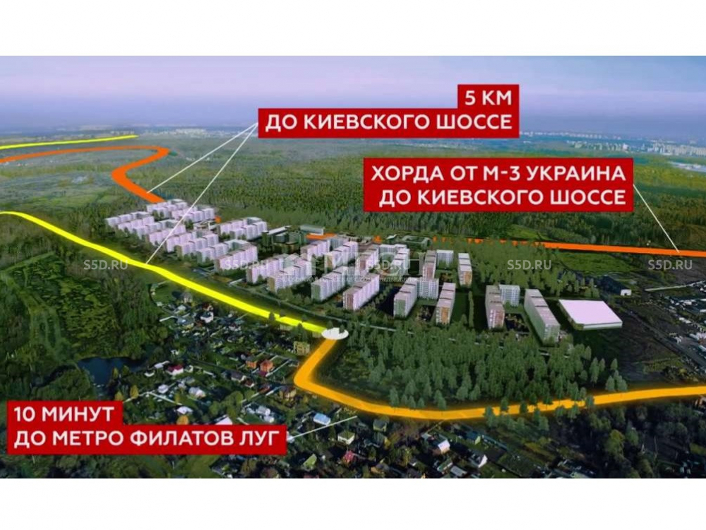 Ближайшие станции метро – 10-15 минут транспортом: Филатов Луг, Саларьево, Прокшино, Рассказовка, Новопеределкино; 14 км до МКАД.