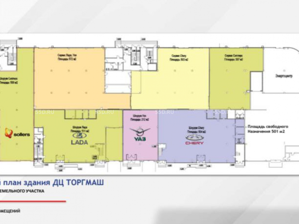 Площадь здания: 12 091 м² (3 этажа + подвал). Год постройки: 2008. Площадь земельного участка: 20 000 м² (2 Га). Полное право собственности: Здание и земельный участок находятся в собственности. Выделенная мощность: 1,0 МВт (собственная электроподстанция). Высота потолков: шоу-рум – 10 м; 1-й этаж – 6 м; 2-й этаж – 3,5 м; подвал – 4 м.