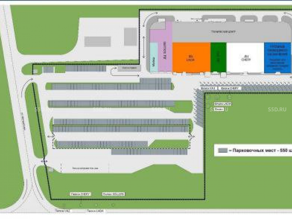Планировка и оснащение: Торговая зона: 4 просторных шоу-рума. Сервисная зона: 3 ремонтные зоны с 19 подъемниками, 2 автомойки. Вспомогательные помещения: Офисы, складские и технические зоны в подвале. Грузовой лифт (500 кг), открытая бесплатная парковка на 550 машиномест. Инженерные системы: Современные системы отопления, вентиляции, кондиционирования, газоснабжения, канализации, безопасности и пожаротушения.