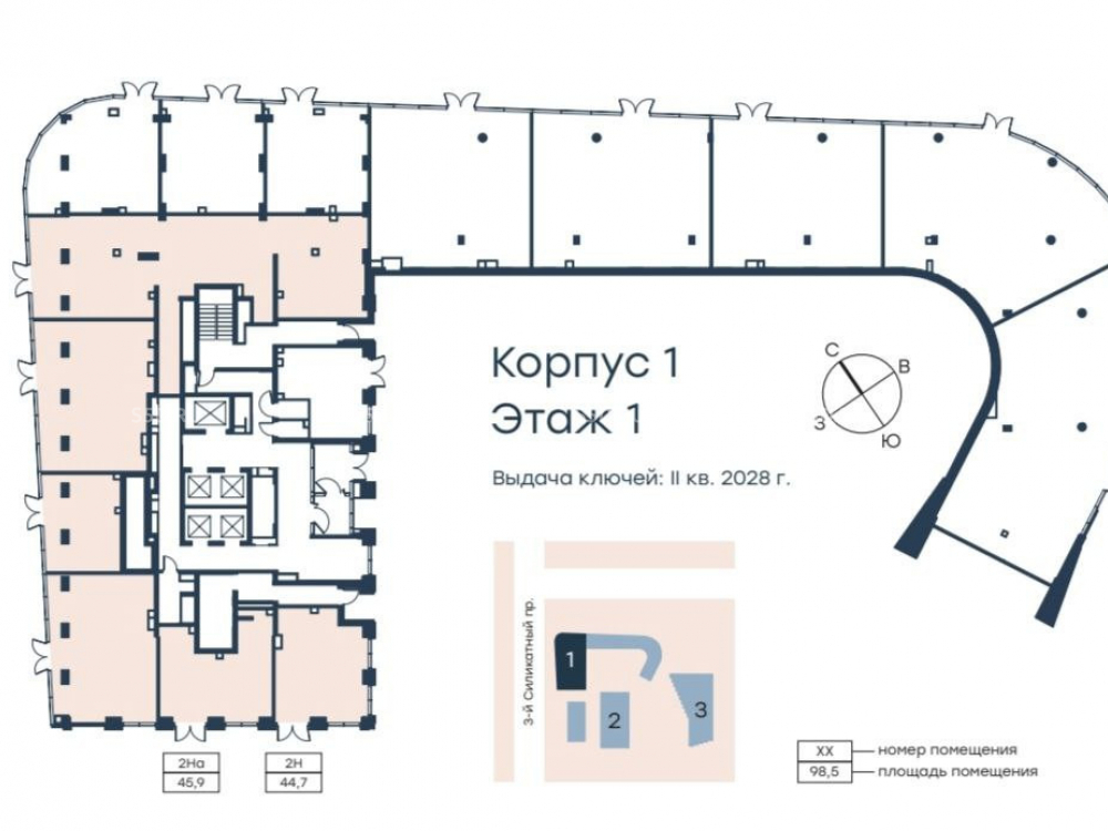 Помещение расположено в престижном жилом комплексе на границе с ЦАО. ЖК «Level Звенигородская» спроектирован Студией Станислава Михаловского и занимает живописное расположение в окружении парков и набережной Москвы-реки. Ближайшая станция метро «Звенигородская» находится в 5 минутах ходьбы. На автомобиле доступны быстрые выезды на ТТК (4 минуты), Садовое кольцо (8 минут) и в центр Москвы (15 минут до Кремля). Первая очередь комплекса включает две башни высотой 48 и 64 этажа с 114 квартирами. После сдачи во 2 квартале 2028 года здесь будут проживать более 2450 человек, что создаст стабильно высокий пешеходный и автомобильный трафик.