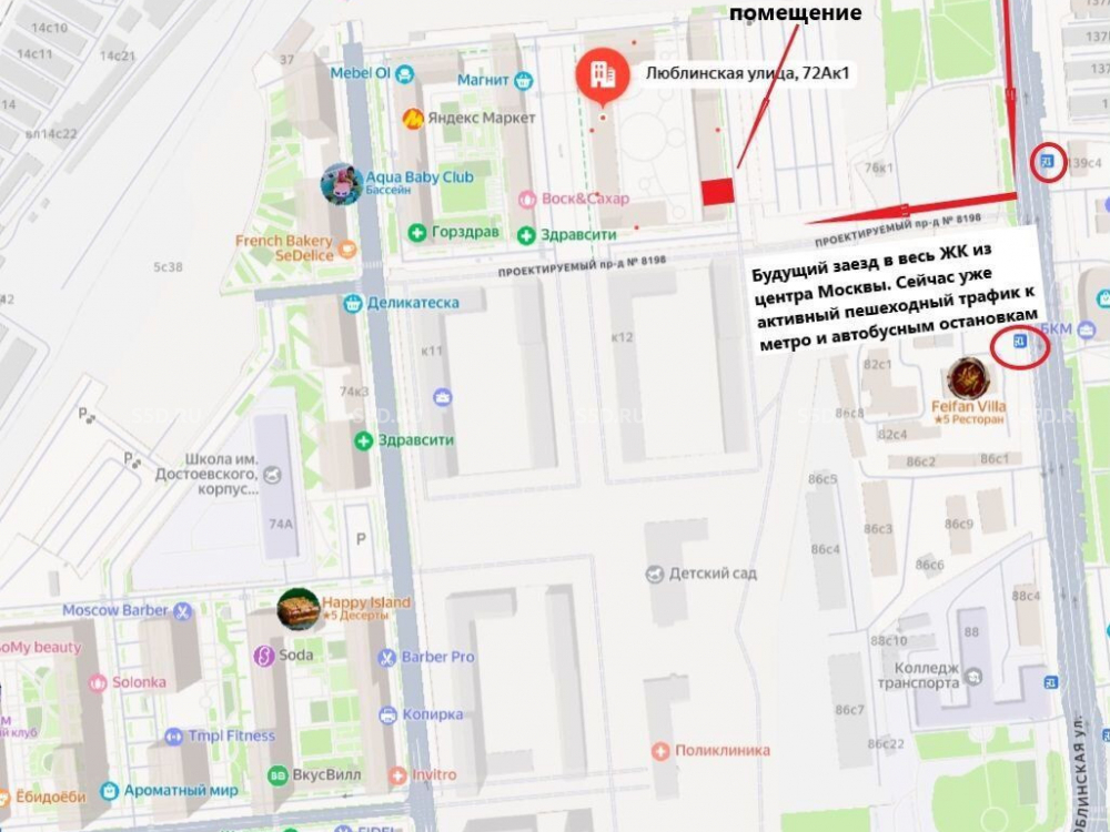 Ближайшая станция метро - Братиславская, 20 минут пешком, станция МЦД D2 - Перерва, 14 минут пешком. У помещения наиболее выигрышное расположение, первое угловое помещение в торговом коридоре в центре ЖК «Люблинский парк», в самой активной и популярной части. В ЖК находятся такие магазины, как: Мираторг, Пятерочка, ВкусВилл. В пешей доступности DDX Fitness, аптеки, школы и детские сады.