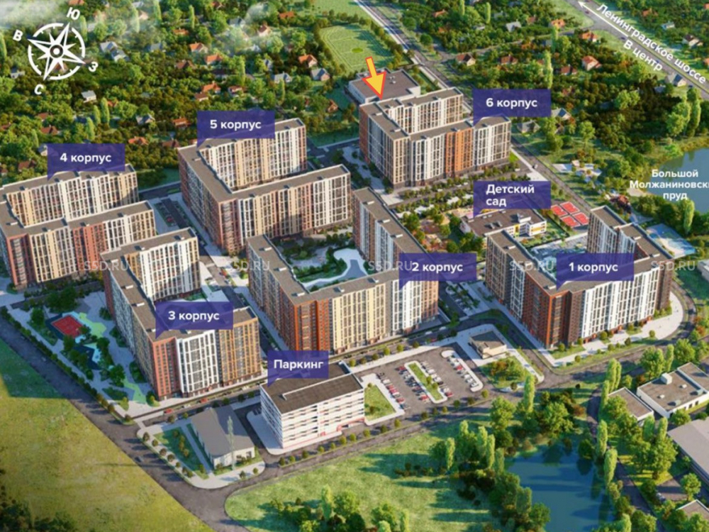 Количество квартир в ЖК – 3 483, расчетное кол-во жителей 8 700 человек. Комплекс находится всего в 7 км от МКАД по Ленинградскому шоссе, сразу после пересечения с Международным шоссе.