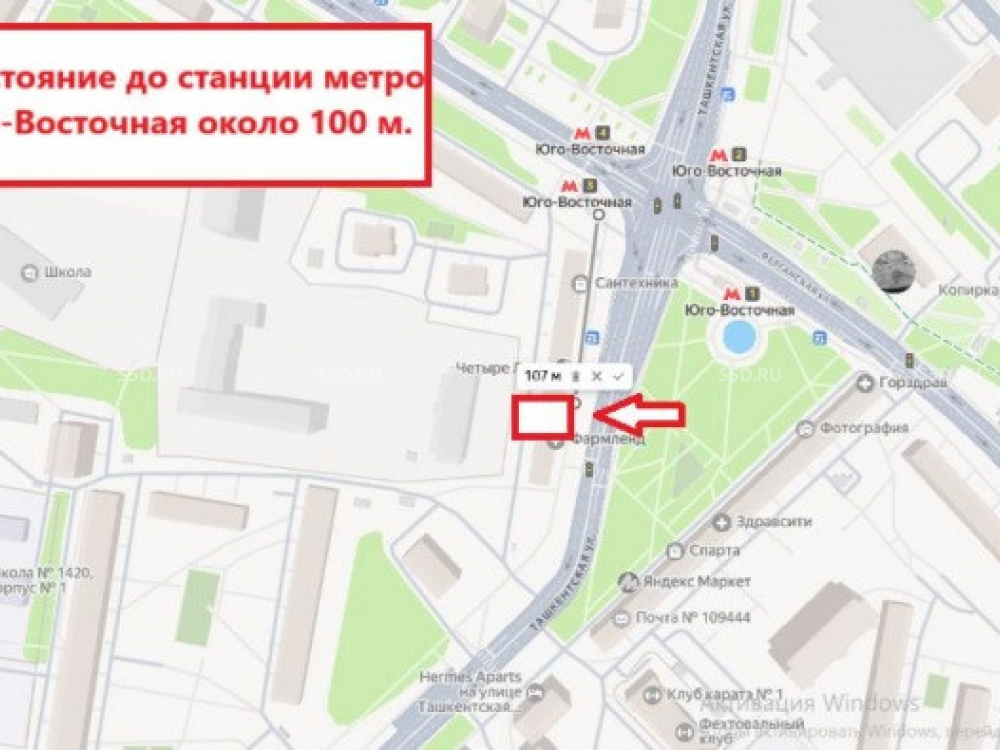 Предлагается в продажу торговое помещение на первой линии Ташкентской улицы непосредственно напротив входа в метро Юго-Восточная , что обеспечивает его сверхинтенсивным пешеходным трафиком. Удобной транспортной доступностью является прямой выезд как на Ташкентскую, так и на Ферганскую улицы. Остановка общественного транспорта расположена прямо напротив входной группы в помещение.