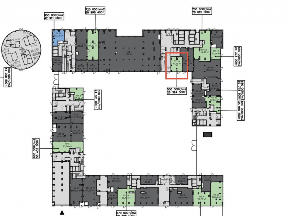 1-й этаж жилого дома. Помещение внутри двора. Общая площадь - 47.99 м². Отдельный вход с улицы со двора. Высота потолков 4.8 м. Витринное остекление. Все центральные коммуникации. Эл. мощность 13 кВт.