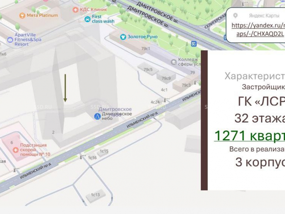 Адрес: Москва, Ильменский проезд, 4к1. Дом построен. Ввод в эксплуатацию — III квартал 2025, получение ключей — до 18 июля 2026. Центр нового высотного района бизнес- и комфорт-класса между Дмитровским шоссе и Октябрьской железной дорогой. Идеальная транспортная доступность: 8 км от ТТК, 5 минут пешком до двух станций метро «Верхние Лихоборы» и «Селигерская». Высокая плотность и платежеспособный трафик: Расположение в окружении жилых комплексов, включая дома свыше 40 этажей. Сформированная коммерческая среда поблизости: магазин мини-формата, алкомаркет, кафе, пекарня.