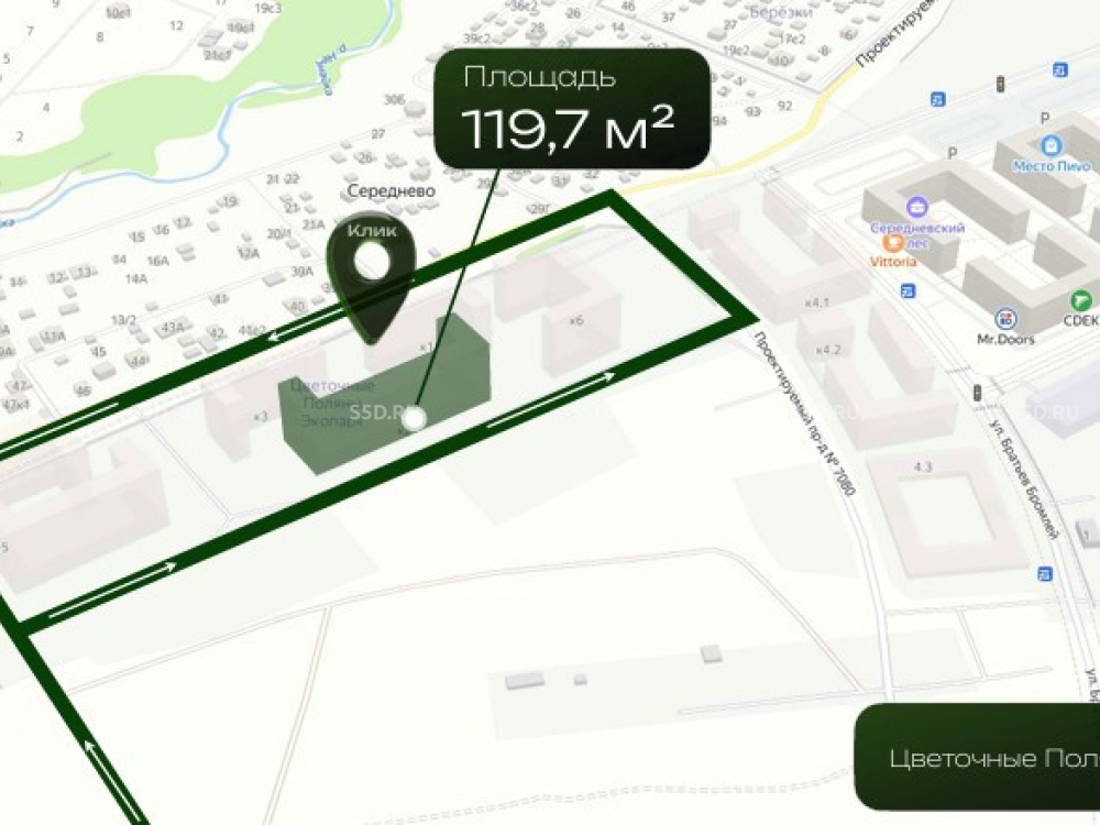 В продажу предлагается помещение свободного назначения, расположенное в современном жилом комплексе от Самолет "Цветочные Поляны", по адресу: Москва, Новомосковский административный округ, Филимонковский район, Новосередневский проспект, 21к4. «Цветочные поляны» строится в Новой Москве, недалеко от Валуевского леса. Ближайшая станция метро «Филатов луг». Помещение расположено в центре застраиваемого ЖК, густонаселенный район с активным трафиком. Напротив расположен паркинг.