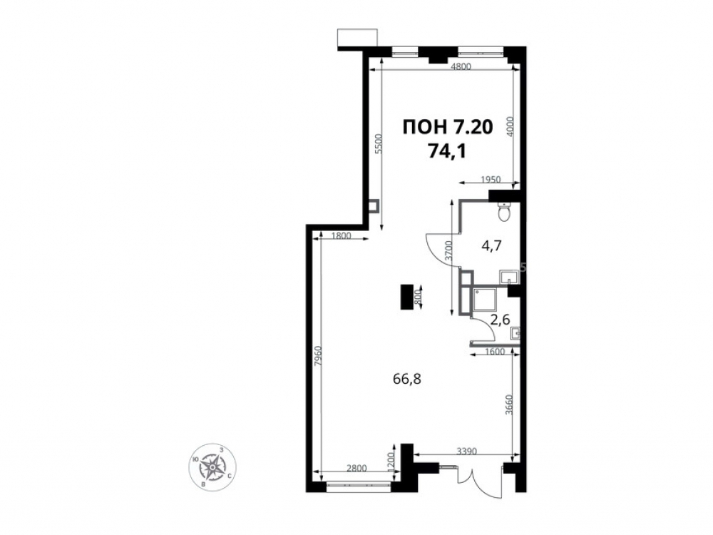 1-й этаж 26и этажного жилого дома, общая площадь - 74.1м2, отдельный вход, 2 витринных окон, помещение свободной планировки, правильной формы. Эл. мощность -0.2 кВт/м2. Все центральные коммуникации. Высота потолков: 4.8м. Отделка: Shell&Core - под отделку.